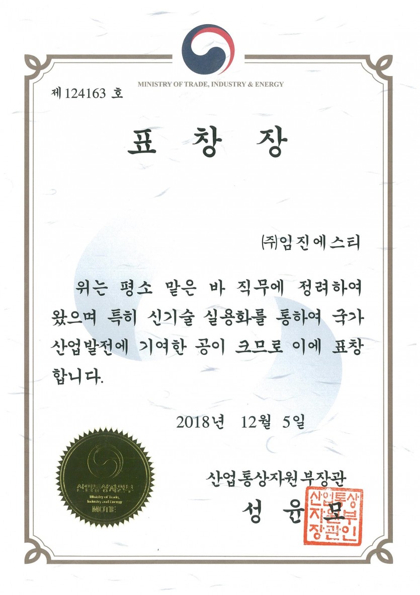 유공자로 선정되어 산업통상부장관상을 수상하였습니다.